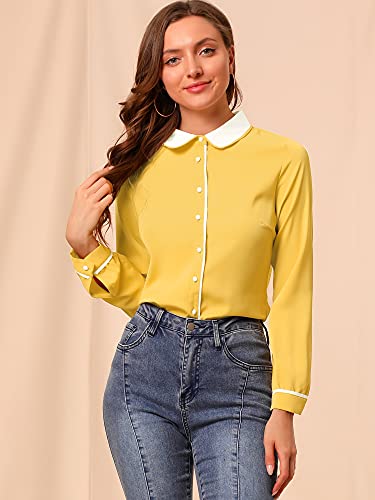 Allegra K Donna Tubo Bottone su Camicia Contrasto Peter Pan Doll Collar Manica Lunga Bottoni Polsino Top Blusa Giallo M