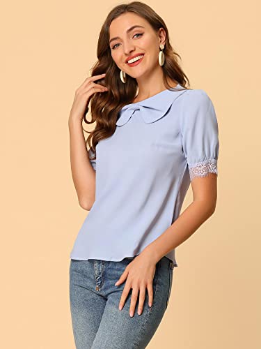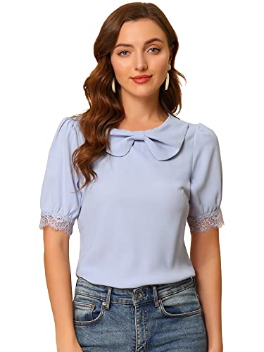 Allegra K Donna Camicetta Elegante a Maniche Corte con Scollo Tondo in Pizzo con Fiocco Azzurro XS