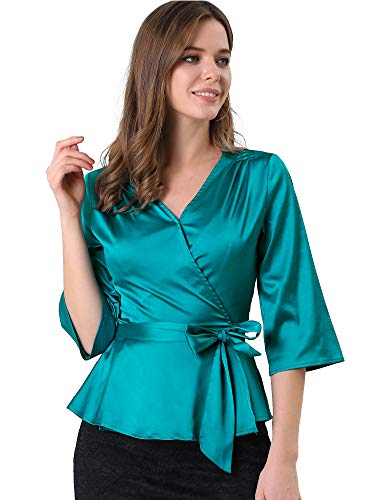 Allegra K Donna Camicetta Peplo Avvolgente Tinta Unita Maniche 3/4 Raso Fiocco Vita Ciano XS