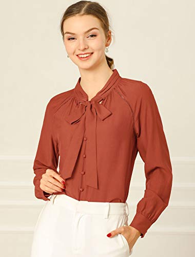 Allegra K Donna Camicia Tinta Unita Fiocco Nastro Collo Manica Lunga Casual Decororo Pulsante Rosso L