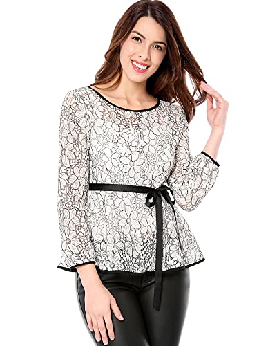 Allegra K Donne Camicia Rotondo Laccetti Manica Lunga Cintura Contrasto Bicolore Peplo Pizzo Top