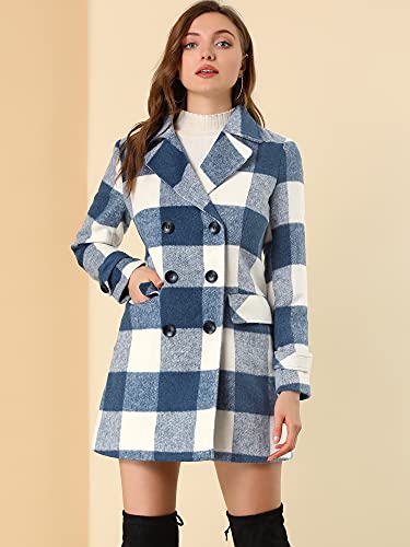 Allegra K Donne Cappotto Doppiopetto Lunga a Quadri Giacca Elegante Plaid Bavero Dentato Doppio Petto Inverno Blu Bianco M