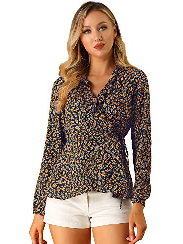 Allegra K Donne dalle Stampe Floreali Volant Crossover V Collo Self Fascetta Peplo Top Blu Scuro XS