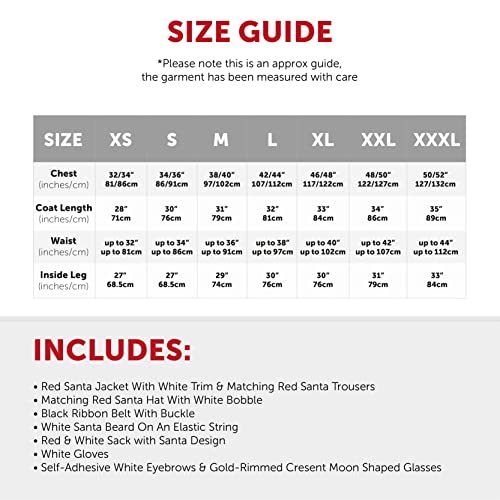 include: una giacca babbo natale in tessuto di feltro rosso con rifiniture bianche, un paio di pantaloni coordinati con coulisse in vita, una cintura a nastro nera con fibbia in tessuto bianco, e una combinazione di barba e parrucca elasticizzata, e un cappello santa in feltro rosso