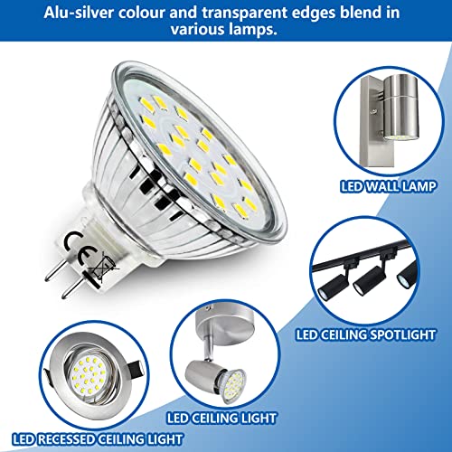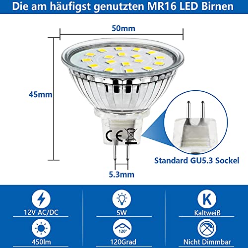Allesgute Confezione Da 10 Lampadine MR16 GU5.3 LED 6000K Bianco Freddo, Lampadina Alogena Da 45W Equivalente A 450lm, Fascio Luminoso Ampio 120°, AC/DC 12V MR16 GU5.3 LED, Non Dimmerabile