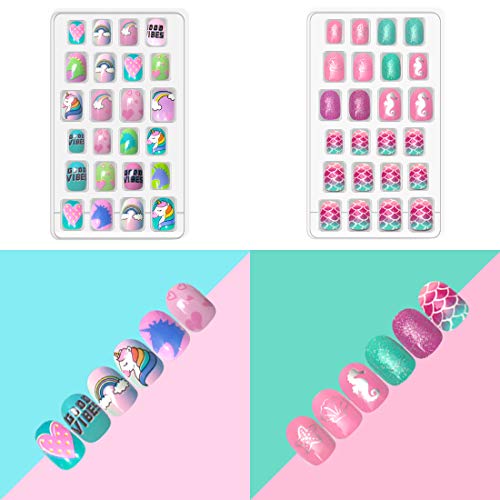Allstarry,Confezione da 5 unghie per bambini, confezione da 120 pezzi, pre-colla, con glitter, colore sfumato, ideale come regalo per bambini e bambine, decorazione per unghie (sirena e unicorno)