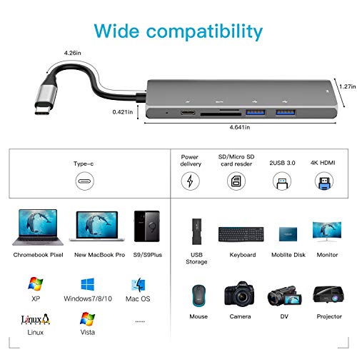 Hub USB C 6 in 1 in Alluminio con HDMI 4K, 2 Porte USB 3.0, USB-C (Ricarica PD),TF,SD Adattatore multiporta per dispositive di Tipo C Compatibile Huawei Mate10, Matebook, Samsung S8, S9