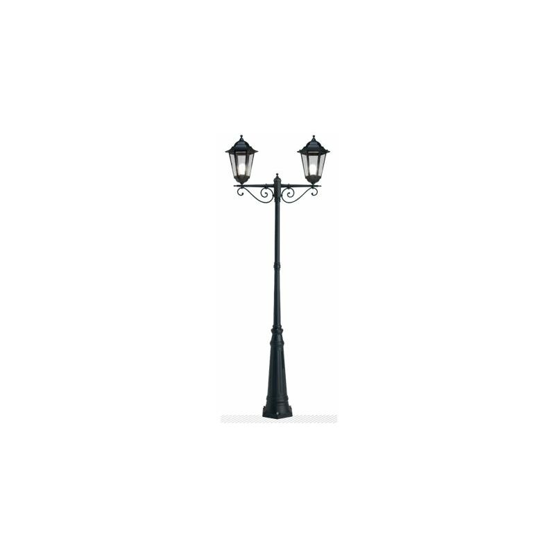 Collezione Geko SI INTERSECA PERFETTAMENTE NEL TUO ARREDAMENTO OUTDOOR Palo a 2 luci di altezza 307,5 cm, con struttura in pressofusione di alluminio, color nero. Diffusori in vetro trasparente con dispositivo di connessione e triangolo di fissaggio a terra. Adatto per lampadina con altezza massima 240 mm (non inclusa).