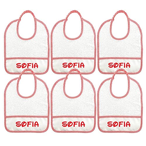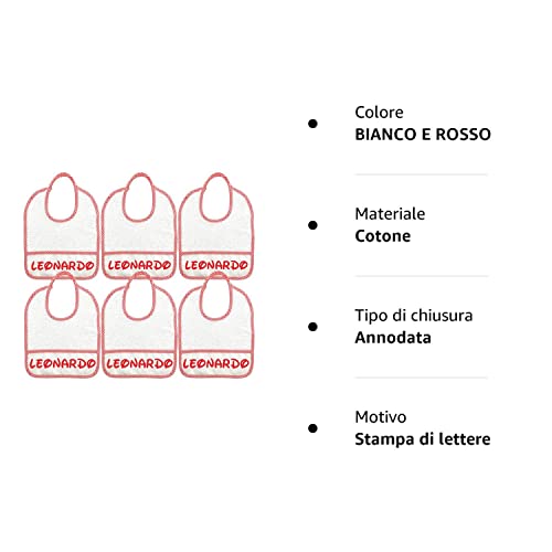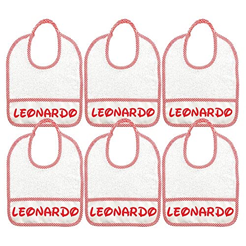 ALMATEX SRL 6 bavaglini personalizzati con nome misura cm.24x27 in spugna con elastico e tasca raccogli briciole personalizzata con nome - 100% cotone - made in italy (BIANCO E ROSSO)
