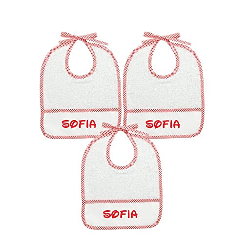 ALMATEX SRL 3 bavaglini personalizzati con nome misura cm.24x27 in spugna con laccetti e tasca raccogli briciole personalizzata con nome - 100% cotone - made in italy (BIANCO E ROSSO)