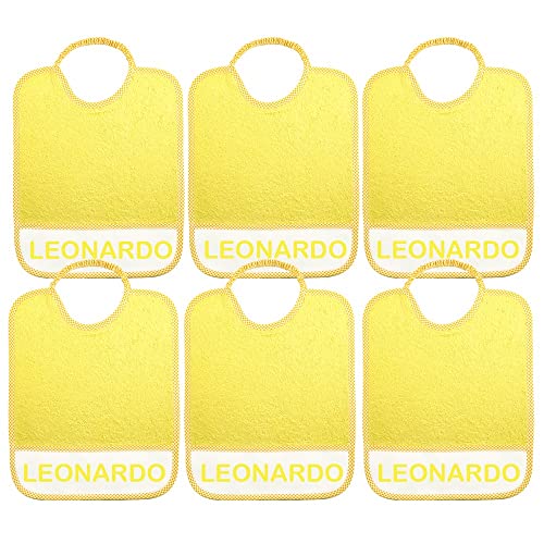 ALMATEX SRL 6 bavaglini personalizzati con nome misura maxi cm.29x36 in spugna con elastico e tasca raccogli briciole personalizzata con nome - 100% cotone - made in italy (GIALLO)