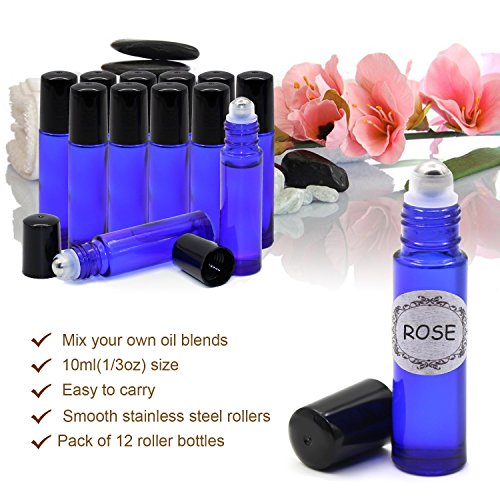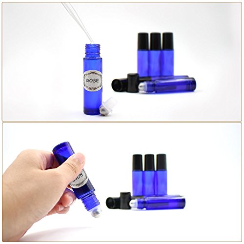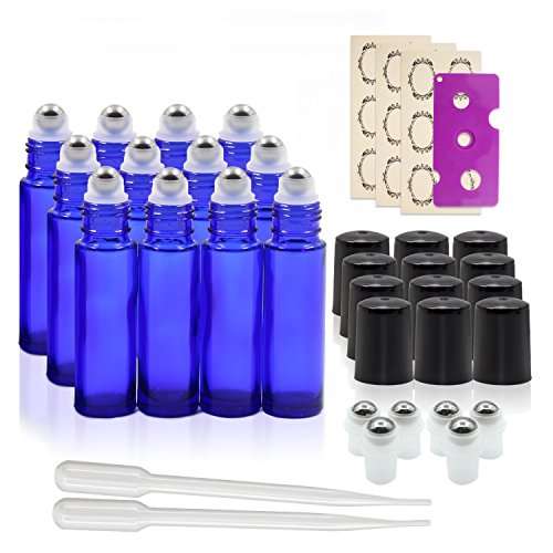 Almondcy 12, 10ml Bottiglie a rulli di vetro blu cobalto con palla di rullo in acciaio inox per olio essenziale - Includere 6 palline a rullo extra, 18 pezzi etichette, olio essenziale apri, 3ml Dropper