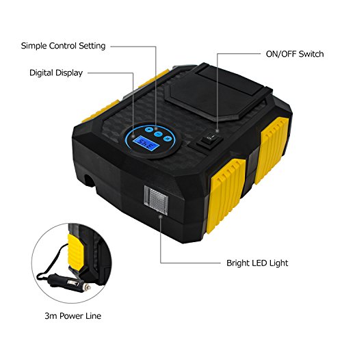 Almondcy YY3609, compressore d'aria portatile per pneumatici. Compressore d'aria digitale portatile elettrico per auto. Kit per pneumatici, bici, moto, palloni, materassini. Include 3 ugelli adattatori e 1 fusibile di ricambio. Funzione 2 in 1 (gonfiaggio pneumatico e illuminazione). Resistente