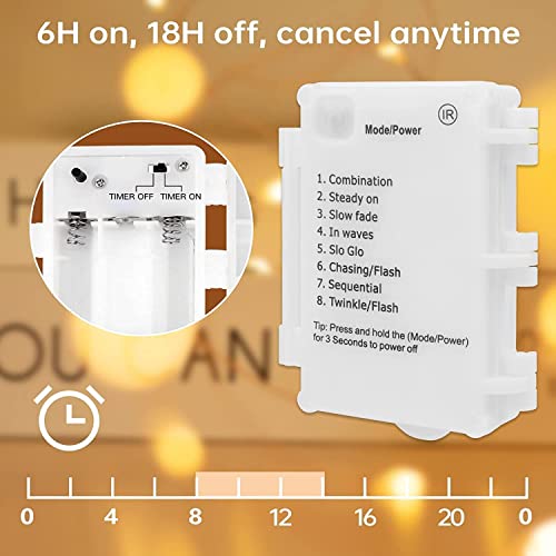 Timing e fai da te: imposta la funzione timer in modo che la lampada funzioni per 6 ore e rimanga chiusa per 18 ore per risparmiare energia e preoccupazioni. Metti la catena luminosa nella tua stanza, sul tavolo o nel tuo giardino e crea il tuo tempo di luce personale per decorarla