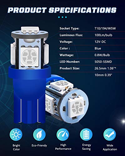 Alopee 30-Pack T10 194 168 2825 Blu LED Light 12V 5SMD 5050 Chipset Car Interior Replacement W5W 175 158 Lampadina per Cupola di Luce, Lampada Cortesia