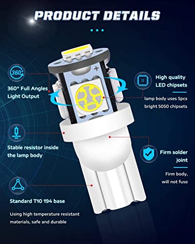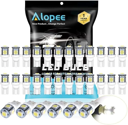 Alopee T10 led W5W luci posizione, 194 168 2825 Illuminazione interna dell'auto per Map Dome Lamp Courtesy Trunk Targa Luci del Cruscotto, Bianco 6000K, 24V-DC, 5 patatine (Confezione da 30)