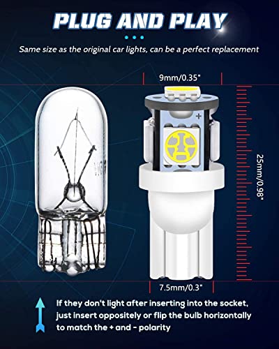 luci posizione led Lunghezza: 1.1 "(2.8 cm) Diametro: Le lampadine sostitutive a LED da 0,43" (1,1 cm) possono adattarsi a numerose applicazioni per veicoli quali luci di cortesia, luci a cupola, luci per mappe, luci del cruscotto e luci del bagagliaio. Questa lampadina da 194 sostituisce una varietà di lampadine alogene o a incandescenza tradizionali, incluse le lampadine N. di serie: 194,158,168,175,194,2825
