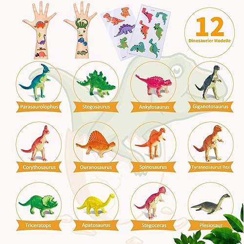 Il prodotto include 12 uova di dinosauro confezionate singolarmente (ogni uovo di dinosauro ha un modello di dinosauro diverso), 12 strumenti per scalpello, istruzioni e 2 adesivi per tatuaggi a dinosauro (adatti per bambini dai 4 anni in su). Le istruzioni allegate possono aiutare i bambini nelle attività di scavo e identire ogni dinosauro scavato per creare i propri modelli di dinosauri.