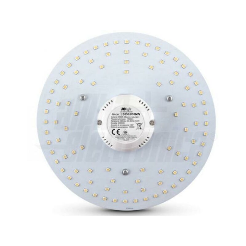 Circolina led Alpha Elettronica 12W 4000K diametro 12cm - LS551/010NW Circolina led con alimentatore incluso. Contenuto Confezione - Modulo led- n3 calamite di fissaggio Specifiche -Numero cicli di accensione 10000 -Tempo di vita L70B50 20000 h-Numero Led 50 -Tipo di led smd 2835-Rischio fotobiologico Esente -Fattore di sopravvivenza 0.9-Alimentatore Esterno (incluso) -Frequenza 50-60Hz-Classe isolamento II -Potenza 12 W-Dimmerabile no -Tens. funzionamento AC 230Vac-Fattore di sfasamento DF 0.7 -Tolleranza d'ingresso ±10%-Fattore di potenza PF 0.55-Altezza 120 mm -Larghezza 120 mm -Diametro 120 mm -Lunghezza 35 mm -Grado di protezione IP20-Attacco Cavetto-Angolo di emissione 120 ° -Fattore mantenimento flusso 0.96-Colore Bianco naturale -Temperatura Colore 4000K-CRI 80 % -Uniformità colore (SDCM) 6-Flusso 1320 lm Tecnologia: Led Attacco: Collegamento tramite cavi elettrici a morsetto Alimentazione: 220-240V Necessita di trasformatore: SI (incluso nella confezione) Gradi Kelvin (K)