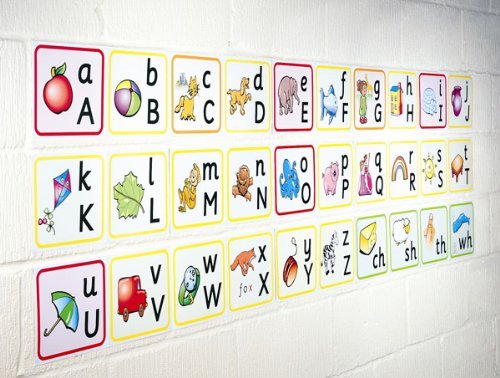 Questo fregio alfabeto dei primi anni contiene 30 esempi di immagini/sonori tra cui quattro digrafi.