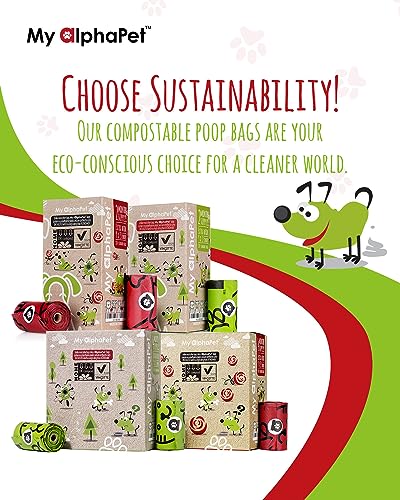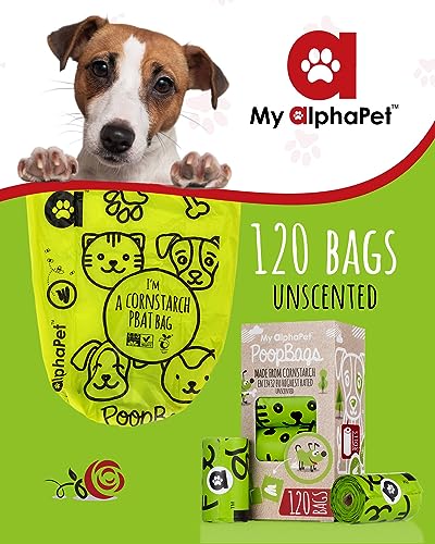 My AlphaPet Sacchetti per Escrementi Cani compostabili - in amido di Mais - con Certificazione EN 13432 - 120 Sacchetti, 8 Rotoli inodore - 23x33 cm - Sacchetti per bisogni a Prova di Perdita