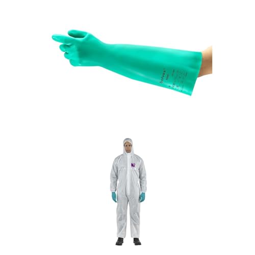 AlphaTec 37-185 Guanti da Lavoro Nitrile Guanto Antinfortunistici, Verde, Taglia L (1 Paio) + AlphaTec 1500 Modello 138, Tuta Integrale con Cappuccio, Bianca, Taglia XL (1 Unità)