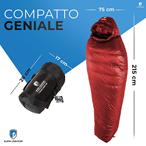 Alpin Loacker ultraleggero 3 stagioni giù sacco a pelo 860g, il sacco a pelo con piccole dimensioni di imballaggio per il campeggio e all'aperto, Trekking, Campeggio,Rosso 195cm destra Zip