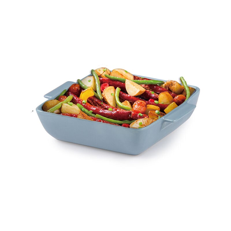 Eine handliche und praktische Form zum Backen und Servieren Ihrer Lieblingsgerichte. Aus Keramik. Produkteigenschaften: · Material: Keramik · Bequeme Griffe · Gewicht: ca. 0,541 kg · Farbe: Blau · Abmessungen: 17 x 17 x 4,5 cm · Verpackungsmaße: 18,5 x 21 x 5 cm · Spülmaschinenfest