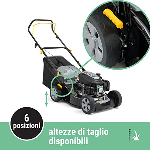 Facile e pratico da usare: Avvio a strappo, altezza di taglio regolabile in 6 posizioni (22-65 mm), manico con impugnatura ergonomica, altezza manico regolabile, ruote scolpite da 200/200 mm dotate di cuscinetti con battistrada morbido