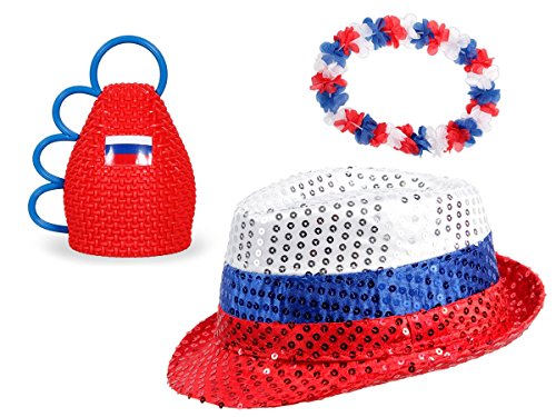 Alsino Offerta: Kit Tifosi Russia (FP-51) Set da 3 Pezzi: 1 x Cappello Fedora con Paillette, 1 x caxirola, 1 x Collana Hawaiana Ultra Estate Festa Spettacolo Decorazione Calcio Coppa Europei mondiali