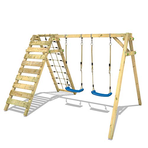 Altalena WICKEY Smart Cliff gioco per bambini, altalena doppia in legno da esterno o da giardino con modulo ampliato per arrampicate