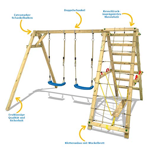 Altalena WICKEY Smart Hike gioco per bambini di colore verde con SurfSwing, altalena doppia in legno da esterno o da giardino con modulo ampliato per arrampicate