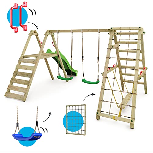 Altalena WICKEY Smart Shake gioco per bambini con scivolo verde e ampliamento per l'arrampicata, altalena doppia in legno da esterno o da giardino