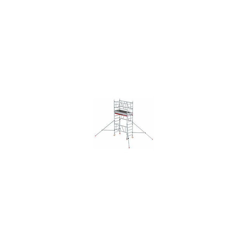 Trabattello a montaggio rapido MiTOWER Plus, piattaforma di legno, altezza di lavoro 4 m. Fornitura = in parte smontato. Lunghezza piattaforma = 1650 mm. Altezza di lavoro = 4 m. Altezza di salita = 2 m. Peso = 91.23 kg. Materiale = alluminio, legno. Portata = 250 kg. Norma = TRBS 2121-1 parte 1. Tipo di prodotto = trabattelli montabili da una persona. Facili da montare da una persona, utilizzabili da 2 persone. Possibilità di raggiungere un'altezza di lavoro di 8 metri in 12 minuti. Compatti e facili da trasportare.