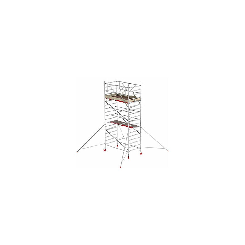 Trabattello mobile RS TOWER 42 largo, piattaforma in legno, lunghezza 2,45 m, altezza di lavoro 6,20 m. Fornitura = smontato. Larghezza piattaforma = 1350 mm. Altezza piattaforma = 4200 mm. Lunghezza piattaforma = 2450 mm. Altezza di lavoro = 6.2 m. Altezza di salita = 4200 mm. Altezza trabattello = 5.2 m. Peso = 189 kg. Materiale = alluminio, legno. Portata = 200 - 750 kg. Diametro ruote = 200 mm. Larghezza trabattello = 1.35 m. Lunghezza trabattello = 2.4 m. Diametro tubo = 50 mm. Norma = EN 1004 classe 3. Tipo di prodotto = trabattelli mobili. Largo trabattello mobile con grande superficie di lavoro. Sicuro e stabile - con rotelle pivottanti con fermo doppio. Per l'impiego in ambienti interni ed esterni. Conformi alla nuova TRBS 2121-1. L'RS TOWER 42 è un trabattello mobile completo. Perfetto per ogni professionista. I giunti a incastro fra le traverse rendono ben stabile l'RS TOWER 42. Con questo trabattello si può lavorare fino a un'altezza massima di lavoro di 10,2 m in esterni e