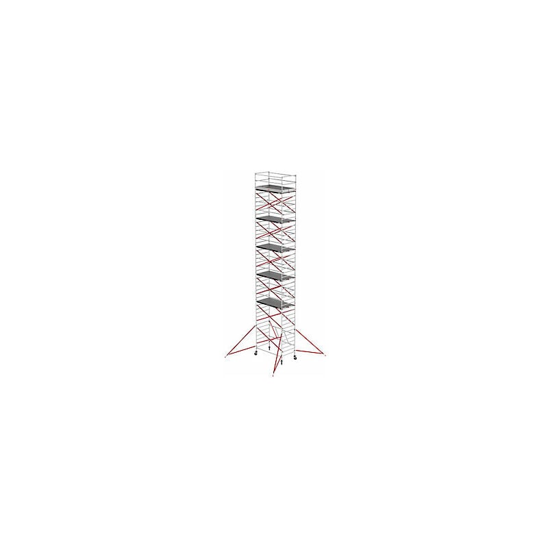 Trabattello mobile RS TOWER 55, piattaforma in legno, lunghezza 1,85 m, altezza di lavoro 13,80 m. Fornitura = smontato. Larghezza piattaforma = 1350 mm. Altezza piattaforma = 11800 mm. Lunghezza piattaforma = 1850 mm. Altezza di lavoro = 13.8 m. Altezza di salita = 11800 mm. Altezza trabattello = 12.8 m. Peso = 433 kg. Materiale = alluminio, legno. Portata = 250 - 750 kg. Diametro ruote = 200 mm. Larghezza trabattello = 1.35 m. Lunghezza trabattello = 1.9 m. Diametro tubo = 50 mm. Norma = EN 1004 classe 3. Tipo di prodotto = trabattelli mobili, trabattelli per interni. Salvaspazio - piegabile a metà. Un pratico aiuto - ampliabile fino a un'altezza di lavoro di 13,80 m. Montaggio e smontaggio più rapidi con l'innovativo sistema di ganci della piattaforma. RS TOWER 55 è un pratico trabattello con grande superficie di lavoro adatto per l'uso in interni ed esterni. Serve un'altezza maggiore? Il sistema è ampliabile con i componenti della serie RS TOWER 5, che permettono di ampliare il