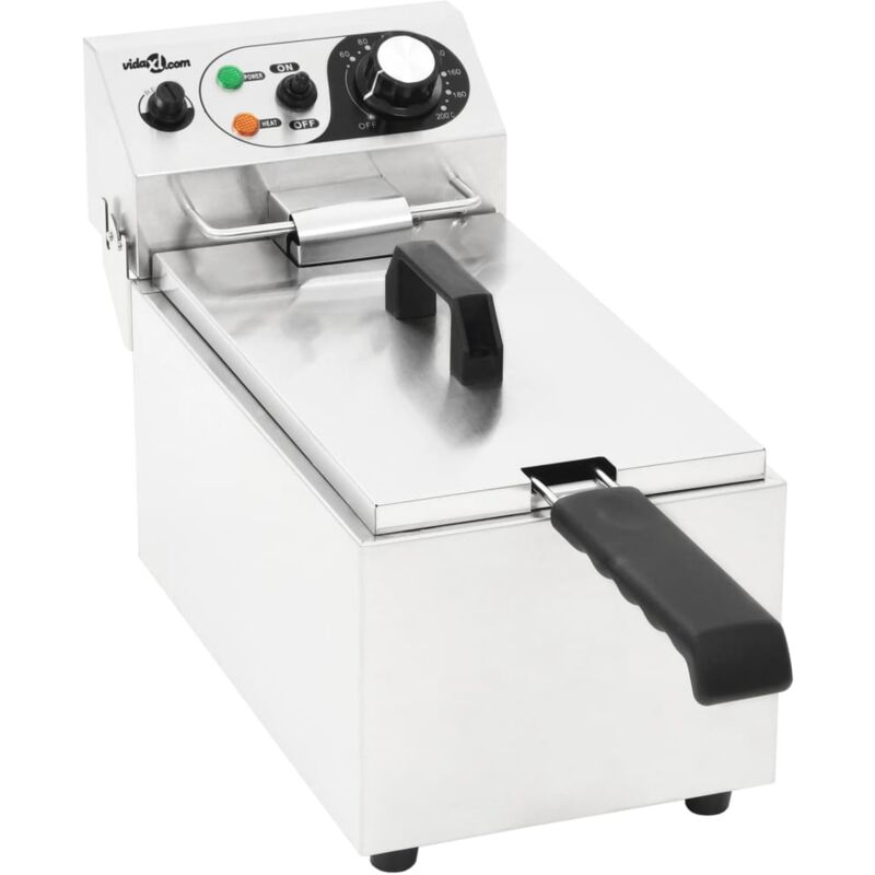 La nostra friggitrice elettrica, facile da utilizzare, è un elettrodomestico da cucina ideale per la preparazione di cibi fritti come pollo, cosce di pollo, patatine fritte e di qualsiasi altro alimento di cui avete voglia. La friggitrice è realizzata in acciaio inossidabile molto resistente, ciò le conferisce un aspetto eccezionale e la rende durevole e facile da pulire. È dotato di una zona fredda che impedisce ai residui di cibo di bruciarsi, migliorando il gusto e riducendo gli odori. La friggitrice è dotata di un regolatore di temperatura che permette di friggere il cibo alla perfezione. Il filtro di sicurezza incluso impedisce gli spruzzi eccessivi, il gorgogliamento ed eventuali traboccamenti, inoltre è particolarmente utile quando si friggono alimenti congelati. Il serbatoio dell'olio e il cestello della friggitrice, con impugnatura in bachelite termoisolata, sono rimovibili per una facile pulizia. Colore: Argento Materiale: Acciaio inossidabile Dimensioni: 19 x 44 x 27,5 cm