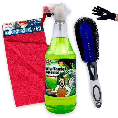 Alu-Teufel - Set di 5 spazzole per cerchioni e panni in microfibra, per la cura dei cerchioni, senza acidi
