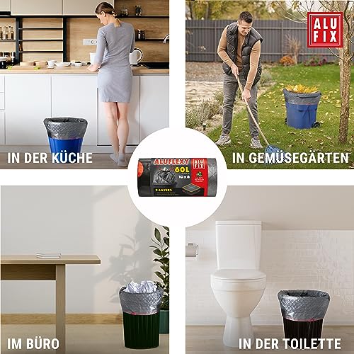 ALUFIX Forti sacchi della spazzatura 60 l, in alluminio, 64 x 69 cm, 4 rotoli con cordino da 10 pezzi, materiale LDPE, estremamente resistenti agli strappi, per gastronomia, casa, riparazioni, rifiuti