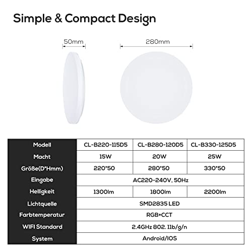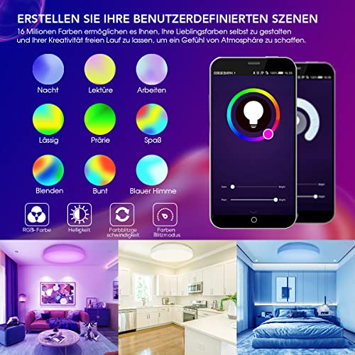 【CONTROLLO APP】 La plafoniera RGB ti consente di controllare le tue plafoniere tramite l'app "Smart Life" tramite WiFi (supporta solo Wi-Fi a 2,4 GHz) Cambia il colore delle plafoniere, programma on/off, luminosità tramite l'APP "Smart Life". Dopo la prima configurazione di rete, anche se la casa è disconnessa, può essere controllata tramite Bluetooth. Ti permette di controllare la tua luce a mani libere con semplici comandi vocali.