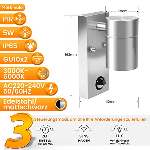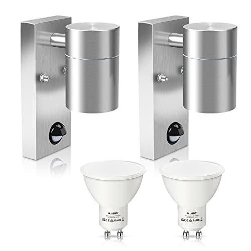 ALUSSO Lampada da parete per esterni in acciaio inossidabile con sensore di movimento PIR IP65 Lampada di sicurezza da giardino con lampadina LED GU10 5W bianco freddo 6000K, argento, confezione da 2