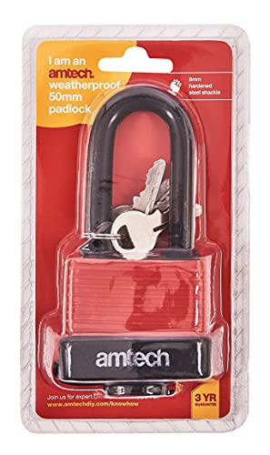 Am-Tech T0765 Lucchetto Impermeabile A Mano Lungo 50mm, Rosso-Nero-Argento
