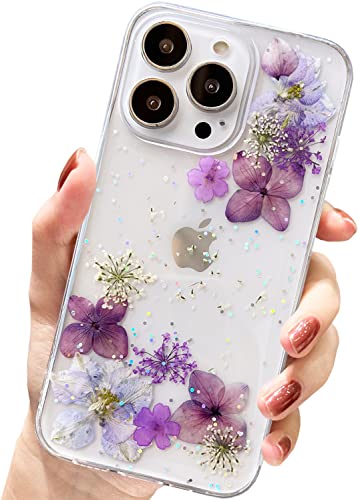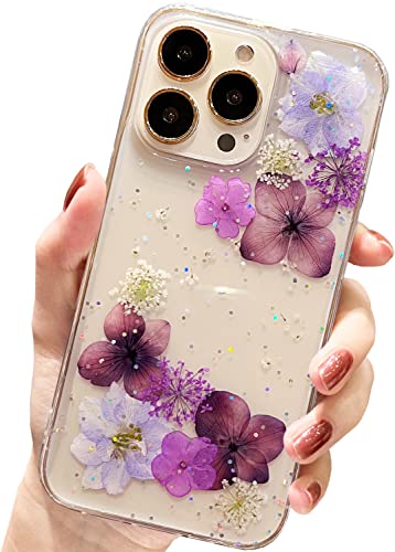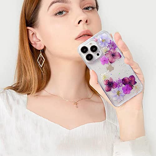 AMART Custodia per iPhone 13 Pro con motivo floreale, trasparente e grazioso glitter pressato con fiori secchi, trasparente, per donne e ragazze, per iPhone 13 Pro (viola glitterato)