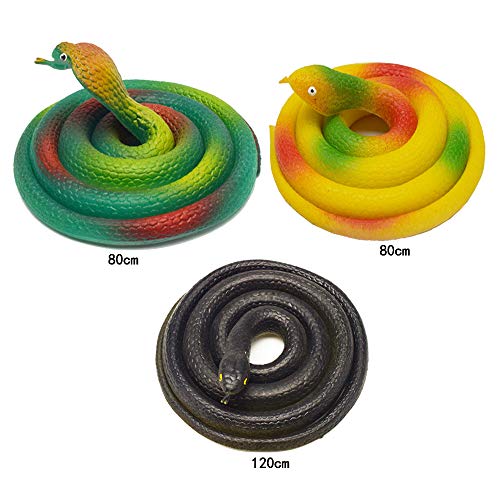 Dimensioni: include 2 dimensioni diverse e 3 serpenti di gomma di colore diverso, serpente di campo giallo 80 cm, cobra verde scuro 80 cm, serpente lungo verde nero 120 cm.