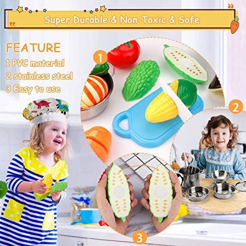 AMAYGA 27 Pezzi Accessori per Giocattoli da Cucina Pentole da Cucina per Bambini Set di Padelle in Acciaio Inossidabile Grembiule e Cappello da Cuoco per Verdure Giocattoli di Finzione Gioco di Ruolo Cucina all'aperto Ragazze e Ragazzi