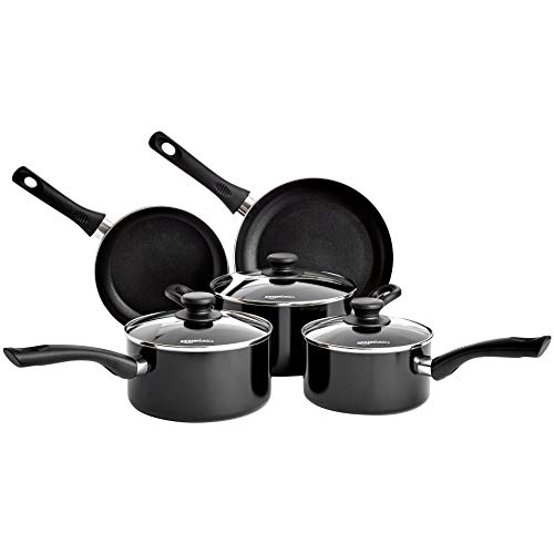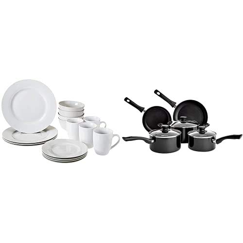 Amazon Basics Set di Stoviglie per 4 Persone, Porcellana, Bianco, 16 Pezzi + Batteria da Cucina Antiaderente in Alluminio, per Piano Cottura a Induzione, con Manici in Bachelite, 5 Pezzi con Coperchi
