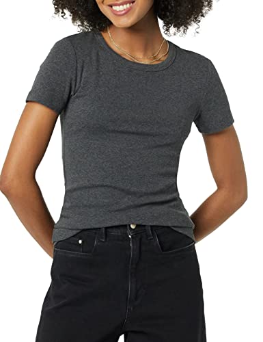 Amazon Essentials T-Shirt Girocollo a Maniche Corte Slim Donna, Pacco da 2, Carbone Puntinato/Rosso Pomodoro, XS