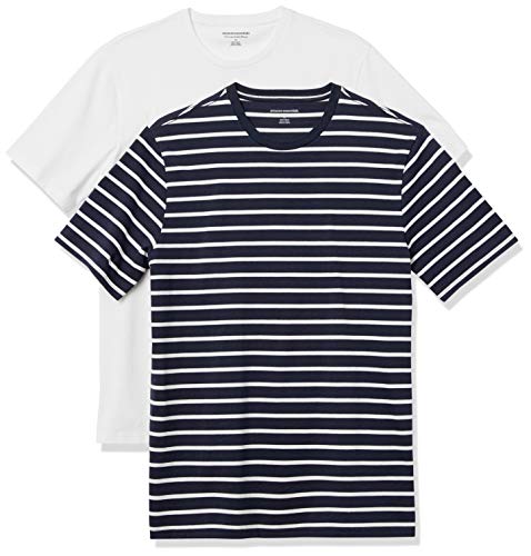 Amazon Essentials T-Shirt Girocollo a Maniche Corte Slim Uomo, Pacco da 2, Blu Marino Righe Orizzontali/Bianco, S