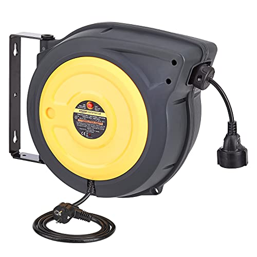 AmazonCommercial - Prolunga avvolgicavo retrattile, resistente, con supporto girevole, 1,5 mm² x 20 m - Grigio, giallo, nero