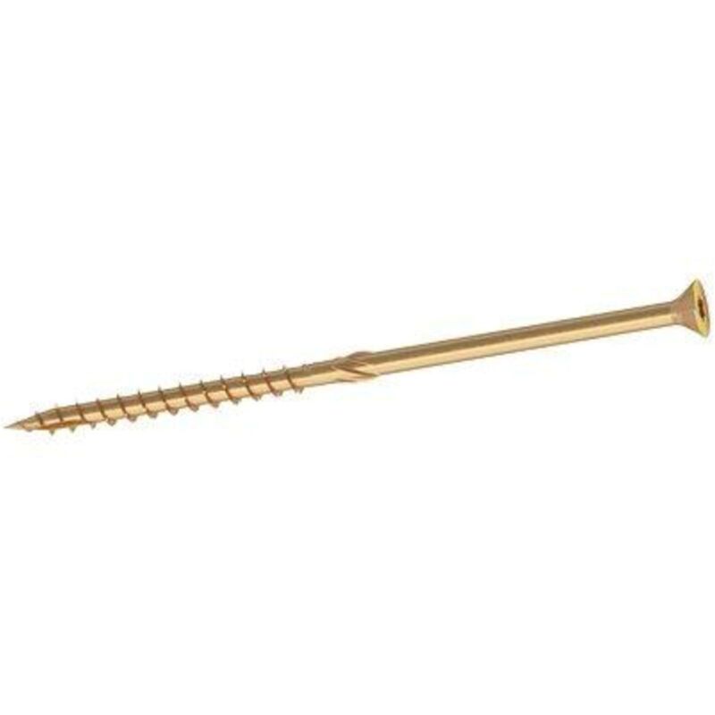 In acciaio zincato giallo. Fresatura sotto testa e in punta. Filetto mordente. Utilizzo senza preforo. Taglio TX. Testa svasata piana. Diametro 6,0 mm Lunghezza 200 mm